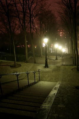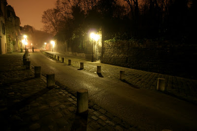 Quelques photos des petites rues bien typiques pour le touriste américain que je suis. Sauf que ce soir-là, un problème insoluble vient compliquer la tâche : impossible de trouver une "balance des blancs" crédible. Explications : la rue est éclairée pars des lampadaires à lumière fluorescente (de dominance "verte"), mais le brouillard très dense diffuse la lumière ambiante de Paris (éclairage avec des lampes au sodium, qui apparait orange). Du coup, impossible de concilier la couleur de la rue et celle du ciel.