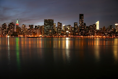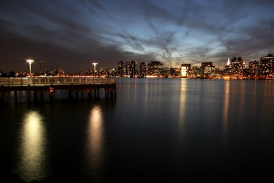 Du coup, on est rentrés dans le Queens au spot habituel pour photographier la skyline. Il apparait que la tombée de la nuit est bien meilleure que la nuit noire pour ces photos. J'ai essayé de rendre l'eau aussi flou que possible en augmentant le temps de pose, de sorte que les vaguelettes se moyennent et laisse une impression très douce qui contraste avec le "crisp" des buildings et de la passarelle.