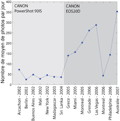 2- Pire, le nombre de photos est globalement en constante augmentation. J'ai passé les 300 photos par jour en Australie ! Circonstance atténuante : j'ai pris beaucoup de panoramas ( plusieurs fichiers par photo)